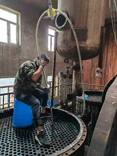 2022年5月28日黑龍江省哈爾濱市呼蘭區(qū)康金鎮(zhèn)小趙村哈爾濱市盛大化工有限公司在費總的精心安排下,孫總親自坐鎮(zhèn)指導,生產(chǎn)廠長潘峰與河南都市機械設(shè)備有限公司喬主任,都紅植技師密切配合,徹底了解GQ-600型智能清洗機的性能和特點,使用600型智能清洗機四個要點1,不能缺水,要使用干凈的靜水,2,過載保護扭力限制器要調(diào)到,軟軸跳動可以自動停下來,不然既不安全,又失去他的意義,3,軟軸要放平拉直,順勁擺放,不能打死彎,盡可能防止扭軸斷軸,4,鉆頭要大小適當,太大了容易卡軸扭軸斷軸,并且一定要直對疏通管道口。三天時間打通清洗了兩臺徹底堵死好、結(jié)垢堅硬的污水蒸發(fā)器,廢水蒸發(fā)器,沒有損壞一根軟軸,沒有損壞一個鉆頭和配件,為糠醛行業(yè)增加了自信,減少了資金損耗,降低成本,提益,做出了標桿!