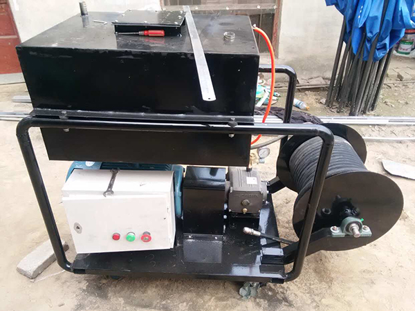 其工作原理為:以汽油機或電動機為動力驅(qū)動高壓泵運轉(zhuǎn),利用高壓水射流在噴頭上產(chǎn)生的推力疏通管道,當噴頭到達管道時,膠管在卷管器拉力(或人力)作用下強制后移,此時高壓水射流來清理管壁并將雜物帶到管外,以達到清洗管道的目的。