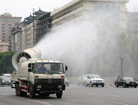 采用高壓水泵和特殊噴嘴將水霧化成直徑約10~200μm的水霧,通過高性能的遠(yuǎn)射風(fēng)機(jī)將水霧送到粉塵集中處,水霧與粉塵結(jié)合、吸附、成團(tuán)、變重,在自身的重力作用下沉降到地面,從而達(dá)到有效降塵的目的。有效除塵率可達(dá)95%