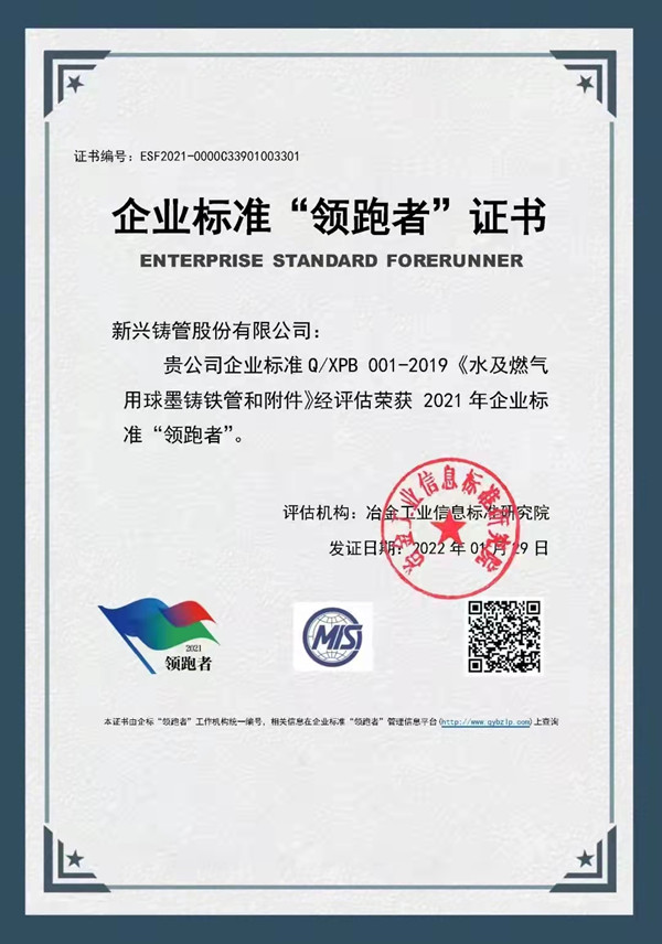經(jīng)新興鑄管股份有限公司標(biāo)準(zhǔn)團(tuán)隊(duì)申報(bào)、冶金工業(yè)信息標(biāo)準(zhǔn)研究院權(quán)威評(píng)審,新興鑄管企業(yè)標(biāo)準(zhǔn)Q/XPB 001-2019《水及燃?xì)庥们蚰T鐵管和附件》榮獲2021年企業(yè)標(biāo)準(zhǔn)“領(lǐng)跑者”稱號(hào),這是該標(biāo)準(zhǔn)繼獲評(píng)2019年企業(yè)標(biāo)準(zhǔn)“領(lǐng)跑者”之后再度保持的一項(xiàng)重要榮譽(yù)。