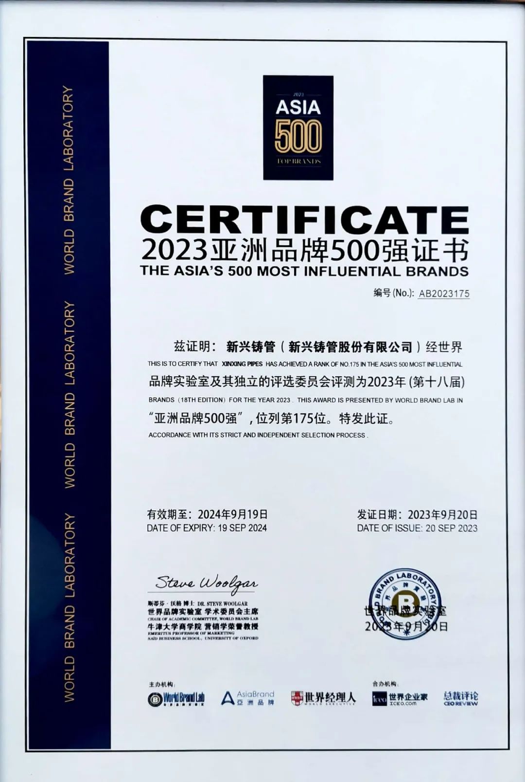 9月20日,由世界品牌實驗室主辦的“2023年亞洲品牌大會”在香港成功舉辦,本屆大會主題為“科技如何推動品牌轉(zhuǎn)型和改變消費者行為”。這是世界品牌實驗室第十八次對亞洲品牌的影響力進(jìn)行測評, 大會發(fā)布了2023年《亞洲品牌500強(qiáng)》排行榜,共有20個國家和地區(qū)的500個品牌入選。新興鑄管憑借強(qiáng)大的綜合實力和品牌影響力,連續(xù)九年入選亞洲品牌500強(qiáng),位列第175位,較去年提升10個名次,品牌價值穩(wěn)步提升。